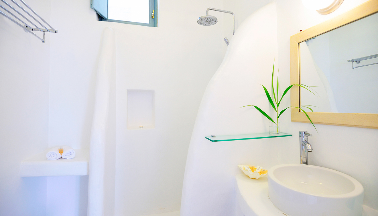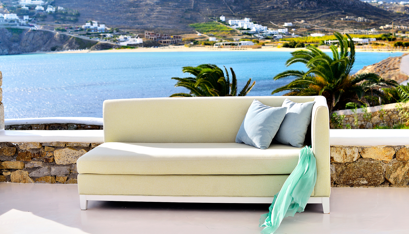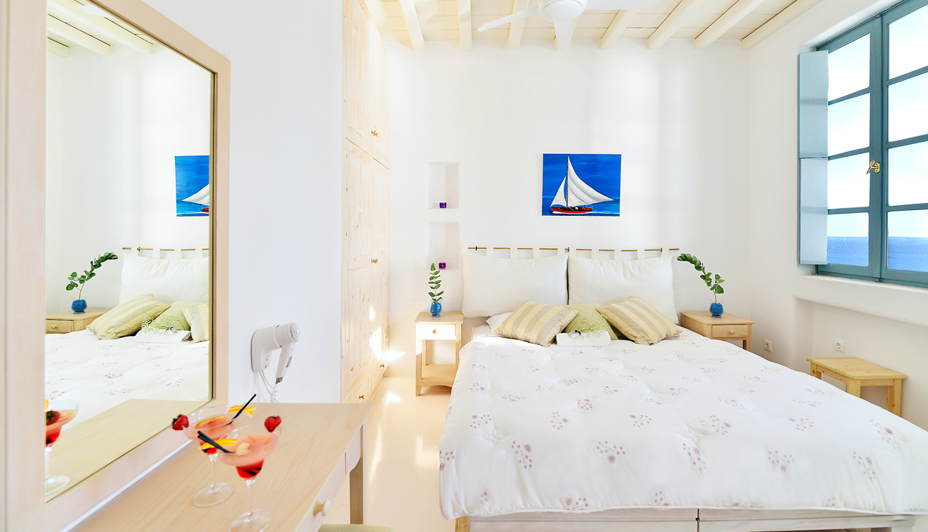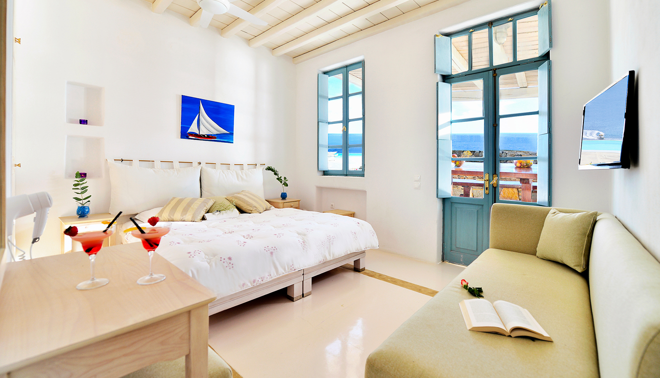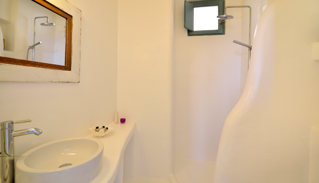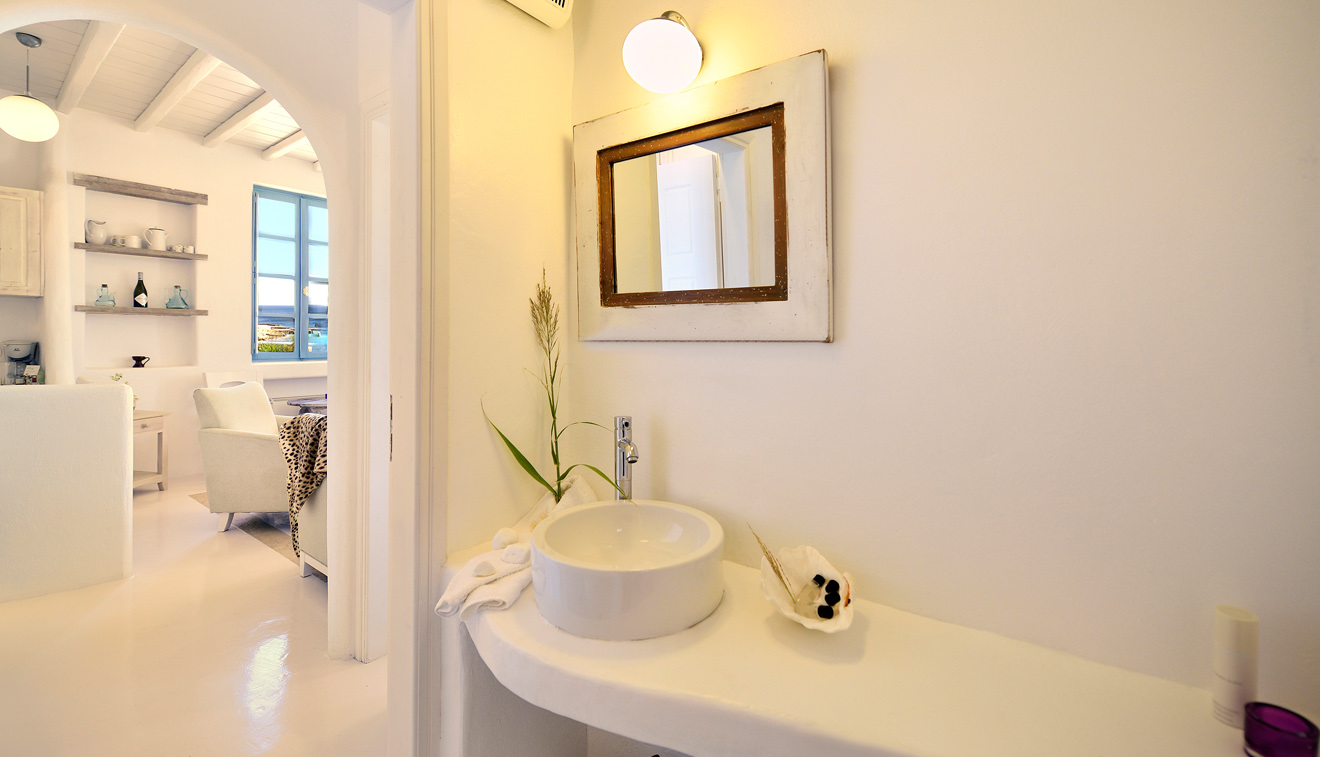 Chic and stylish suites elegantly decorated in pastel and creamy beige tones and natural elements to create a sleek Myconian ambience. Vast interiors split in two spaces and a private patio with unparalleled panoramic views to the Aegean Sea, create a bright and comfortable environment. Uniquely designed to offer the ultimate in comfort, this suite can be conveniently arranged to accommodate up to 4 persons.