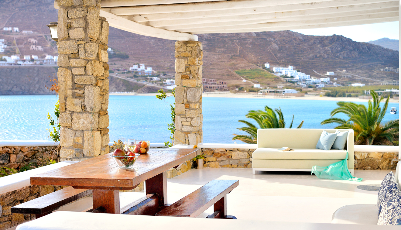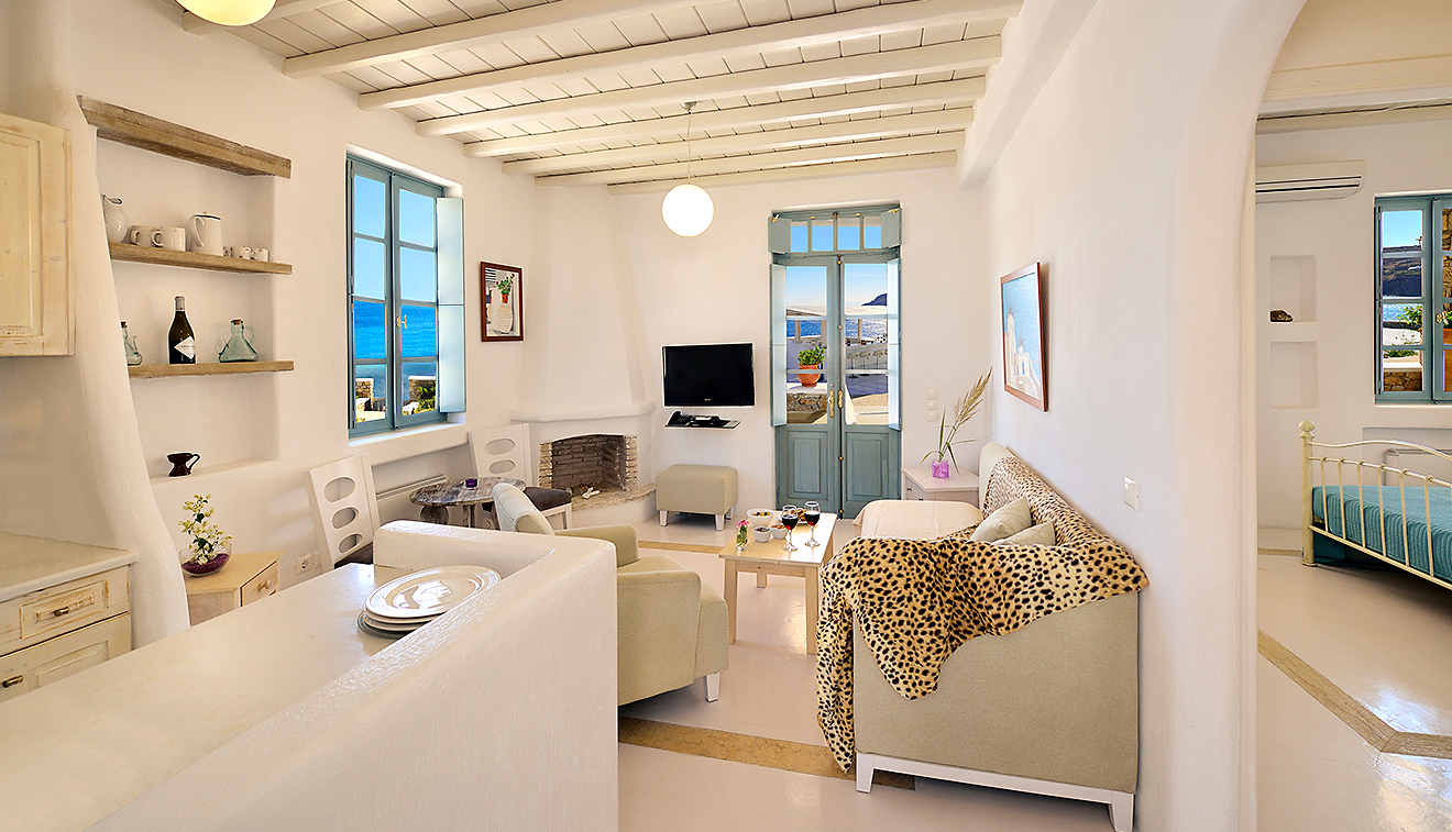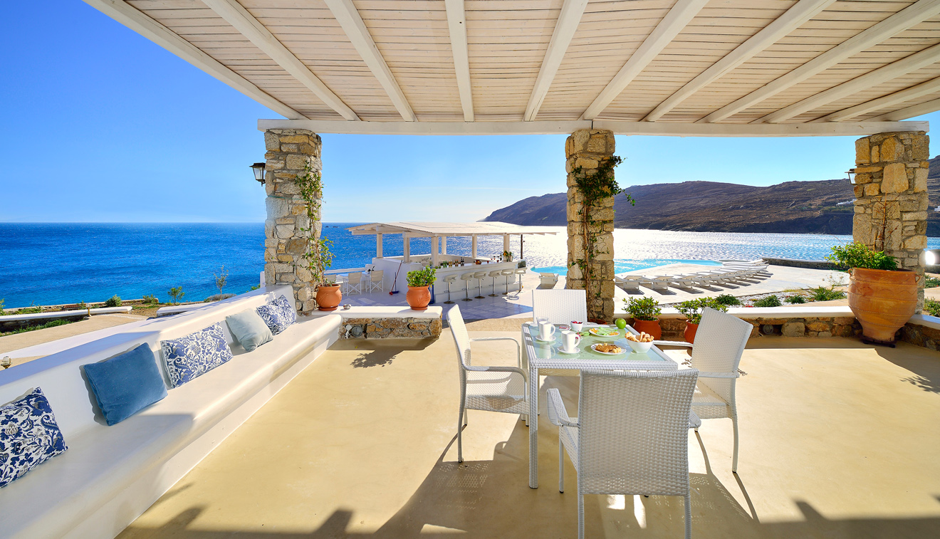 Vast interiors split in two spaces and a private patio with unparalleled panoramic views to the Aegean Sea.