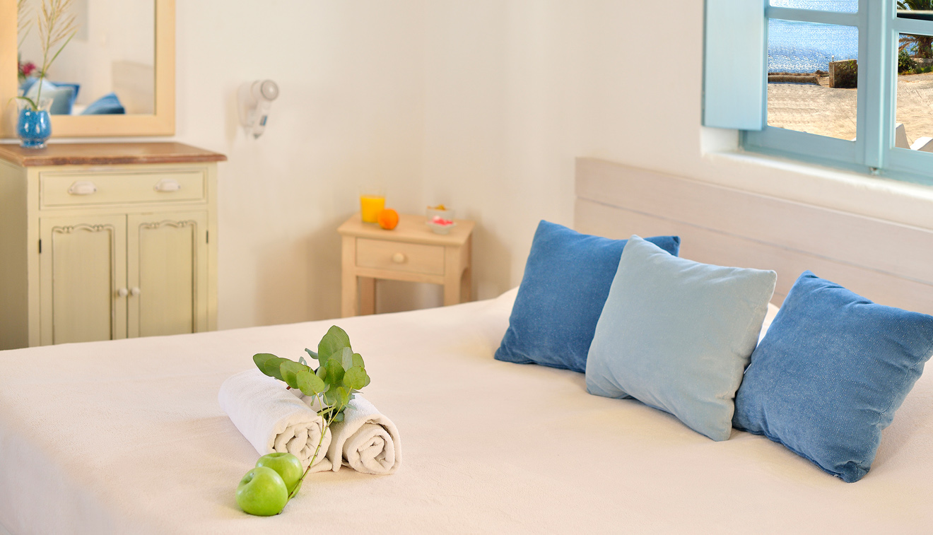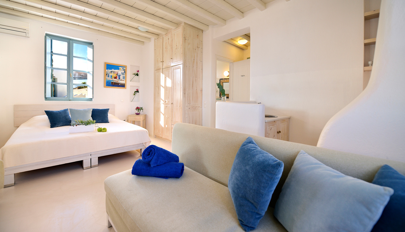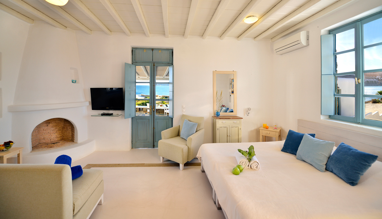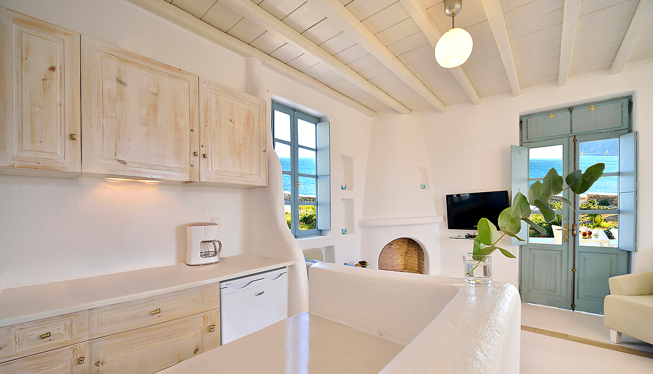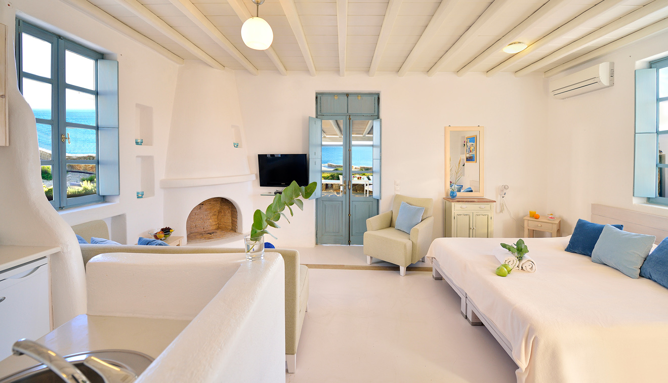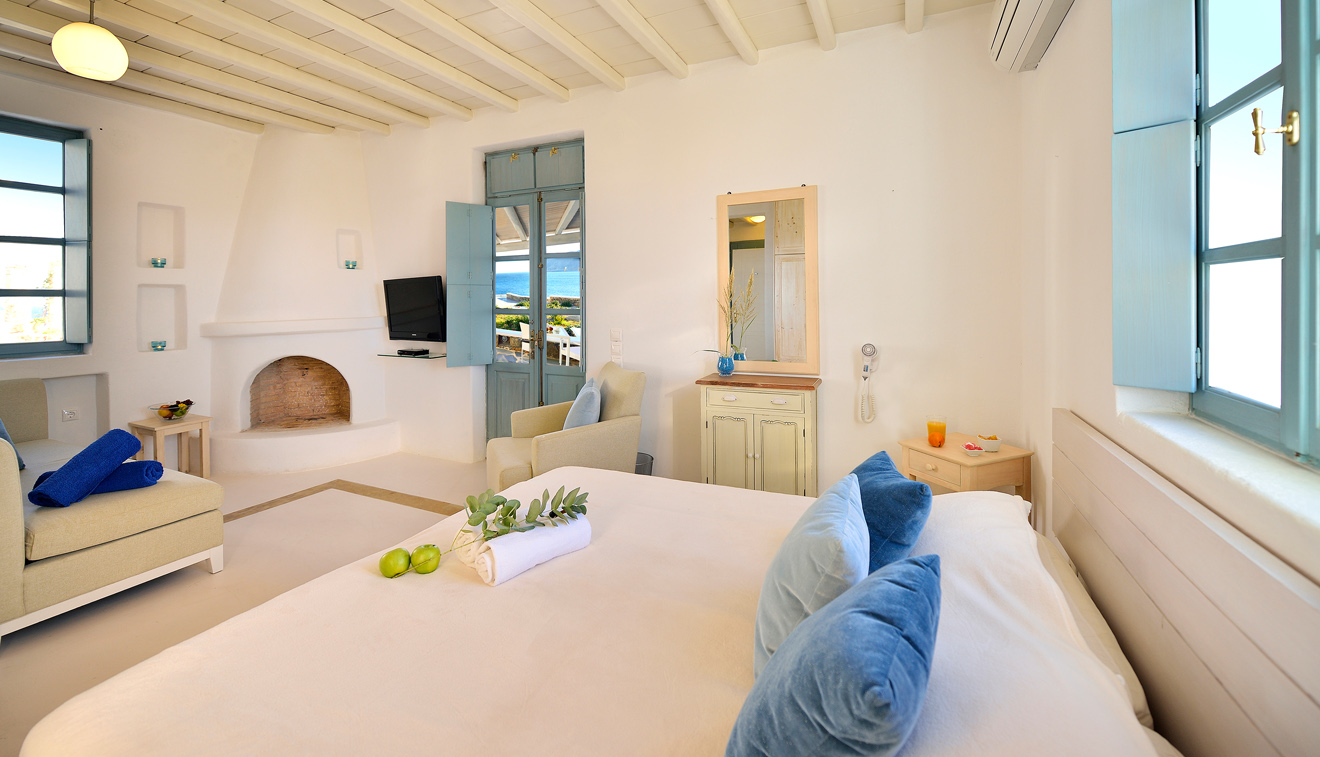 Combining unobstructed Sea views and a soothing ambience in creamy beige tones with pastel touches, this stylish luxury suite is the ultimate haven to relax in tranquility and comfort on a velvet blue Sea background. With vast interiors and a spacious private patio, is a delightful accommodation for two to three persons.